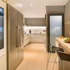 Offene, Große Moderne Küche in U-Form mit Waschbecken, beigen Schränken, Küchenrückwand in Beige, braunem Holzboden, braunem Boden und beiger Arbeitsplatte in Sonstige — Houzz