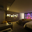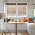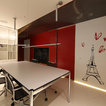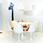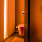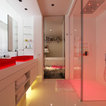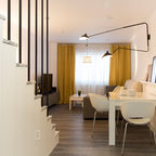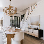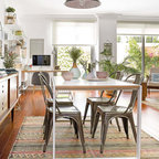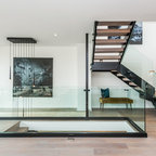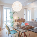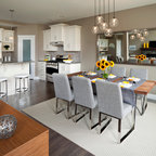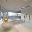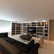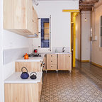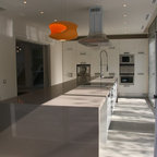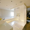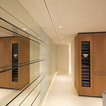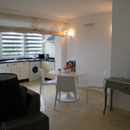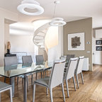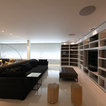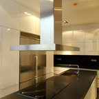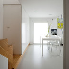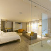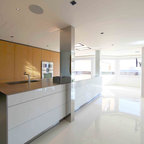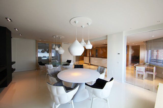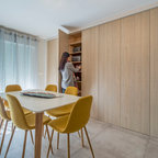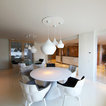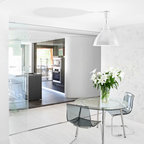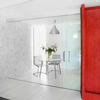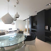 La cocina adyacente se hace totalmente visible, gracias a un limpio cerramiento de vidrio. Se accede a ella a través de puertas correderas del mismo material.