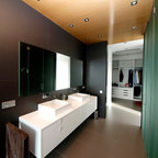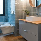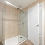 Modernes Duschbad mit Eckdusche, weißen Fliesen, Mosaikfliesen, weißer Wandfarbe, Aufsatzwaschbecken, Waschtisch aus Holz, grauem Boden, Schiebetür-Duschabtrennung und brauner Waschtischplatte in Madrid — Houzz