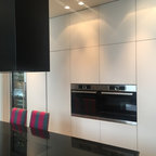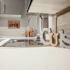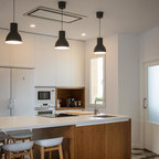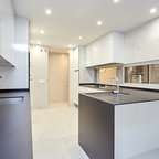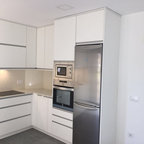Offene, Kleine Moderne Küche in U-Form mit flächenbündigen Schrankfronten, Halbinsel, Unterbauwaschbecken, weißen Schränken, Quarzwerkstein-Arbeitsplatte, Küchenrückwand in Grau, Küchengeräten aus Edelstahl und braunem Holzboden in Sevilla — Houzz