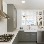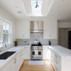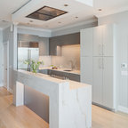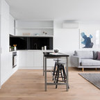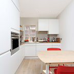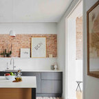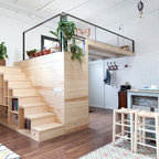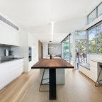 Offene, Einzeilige, Große Industrial Küche mit flächenbündigen Schrankfronten, weißen Schränken, Küchenrückwand in Weiß, Rückwand aus Stein, schwarzen Elektrogeräten und Kücheninsel in Barcelona — Houzz