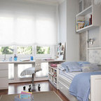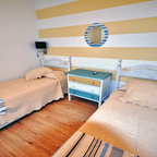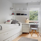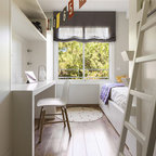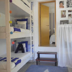 Mittelgroßes, Neutrales Maritimes Kinderzimmer mit weißer Wandfarbe, braunem Holzboden, braunem Boden und Schlafplatz in Sonstige — Houzz