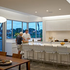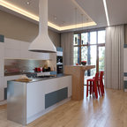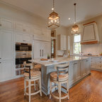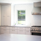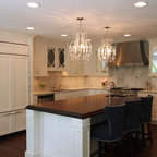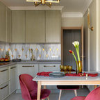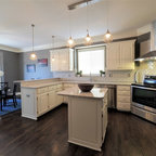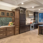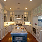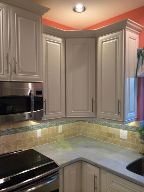 Mittelgroße Klassische Wohnküche in L-Form mit profilierten Schrankfronten, weißen Schränken, Granit-Arbeitsplatte, bunter Rückwand, Doppelwaschbecken, Rückwand aus Keramikfliesen, Küchengeräten aus Edelstahl, Travertin und Kücheninsel in Miami — Houzz