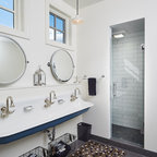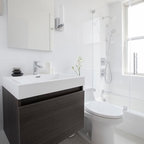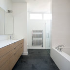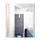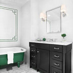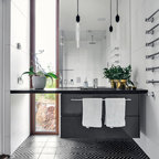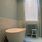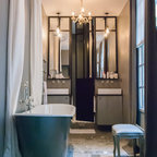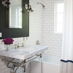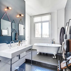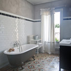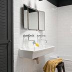 Modernes Badezimmer En Suite mit Einbaubadewanne, weißen Fliesen, Metrofliesen, schwarzer Wandfarbe und Trogwaschbecken in Montpellier — Houzz