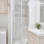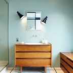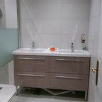 Couleurs plafond et carrelage. Lavabo meuble simple.