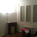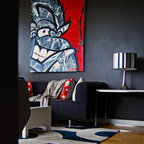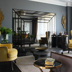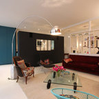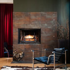 Mittelgroßes, Fernseherloses, Offenes Modernes Wohnzimmer mit schwarzer Wandfarbe, Betonboden und Kamin in Montpellier — Houzz