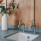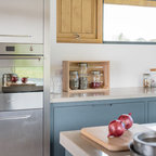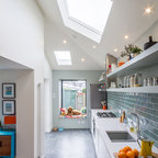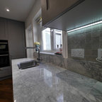 Mittelgroße Moderne Küche in L-Form mit Unterbauwaschbecken, grauen Schränken, Küchenrückwand in Weiß, Rückwand aus Marmor, Küchengeräten aus Edelstahl, dunklem Holzboden, Kücheninsel, braunem Boden und weißer Arbeitsplatte in London — Houzz