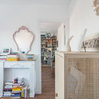 Shabby-Chic-Style Arbeitszimmer mit weißer Wandfarbe, Porzellan-Bodenfliesen und weißem Boden in Sonstige — Houzz