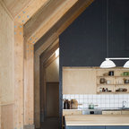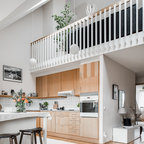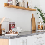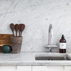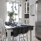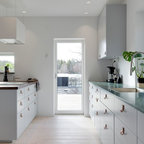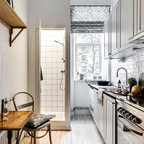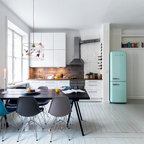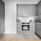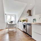 Mittelgroße Nordische Wohnküche in L-Form mit flächenbündigen Schrankfronten, hellen Holzschränken, schwarzer Arbeitsplatte, Unterbauwaschbecken, Küchenrückwand in Weiß, schwarzen Elektrogeräten und schwarzem Boden in Stockholm — Houzz
