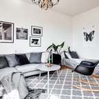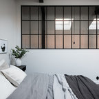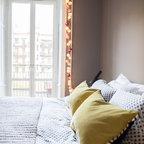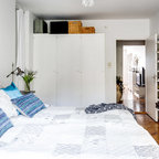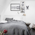 Mittelgroßes Skandinavisches Hauptschlafzimmer mit grauer Wandfarbe und hellem Holzboden in Stockholm — Houzz