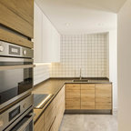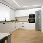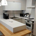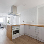 Offene, Zweizeilige, Mittelgroße Skandinavische Küche mit flächenbündigen Schrankfronten, weißen Schränken, Küchenrückwand in Weiß, Rückwand aus Metrofliesen und weißen Elektrogeräten in Madrid — Houzz