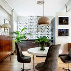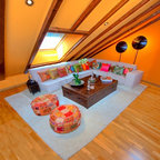 Mittelgroßes, Repräsentatives, Fernseherloses, Offenes Eklektisches Wohnzimmer ohne Kamin mit weißer Wandfarbe und braunem Holzboden in Madrid — Houzz