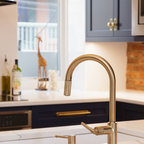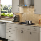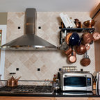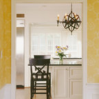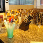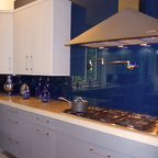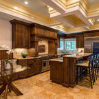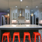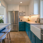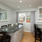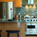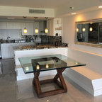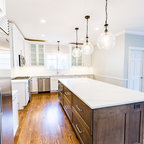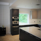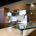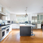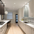 Mittelgroße Moderne Wohnküche in U-Form mit Unterbauwaschbecken, flächenbündigen Schrankfronten, braunen Schränken, Marmor-Arbeitsplatte, Küchenrückwand in Weiß, Rückwand aus Marmor, Küchengeräten aus Edelstahl, Kücheninsel, braunem Boden und braunem Holzboden in Denver — Houzz