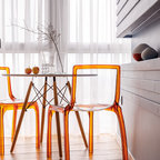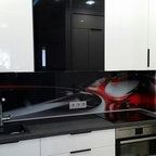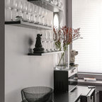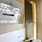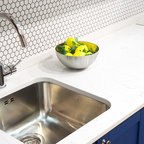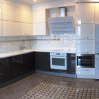 Kleine, Offene Moderne Küche in U-Form mit Einbauwaschbecken, Schrankfronten mit vertiefter Füllung, weißen Schränken, Arbeitsplatte aus Holz, Küchenrückwand in Weiß, weißen Elektrogeräten, brauner Arbeitsplatte und buntem Boden in Moskau — Houzz