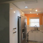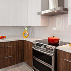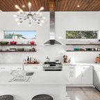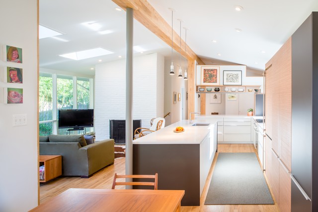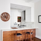 Offene Moderne Küche in U-Form mit Unterbauwaschbecken, flächenbündigen Schrankfronten, weißen Schränken, braunem Holzboden, Halbinsel und braunem Boden in Washington, D.C. — Houzz