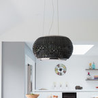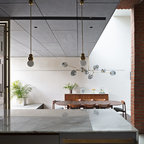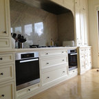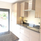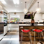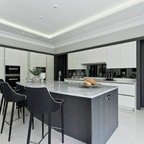 Moderne Küche mit Unterbauwaschbecken, flächenbündigen Schrankfronten, weißen Schränken, Küchenrückwand in Rot, Glasrückwand und Küchengeräten aus Edelstahl in London — Houzz