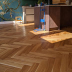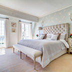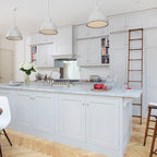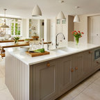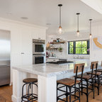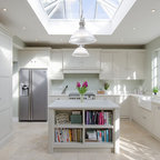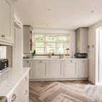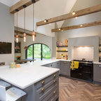 Offene, Zweizeilige Klassische Küche mit Kassettenfronten, weißen Schränken, Küchenrückwand in Metallic, Glasrückwand, Küchengeräten aus Edelstahl, hellem Holzboden, Kücheninsel und beigem Boden in Sonstige — Houzz