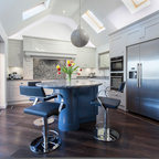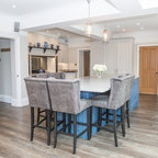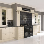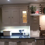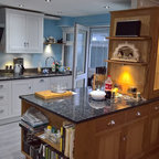Einzeilige, Mittelgroße Klassische Küche mit Landhausspüle, Schrankfronten mit vertiefter Füllung, Granit-Arbeitsplatte, bunter Rückwand, Rückwand aus Keramikfliesen, Kücheninsel, braunem Boden, schwarzer Arbeitsplatte, grauen Schränken und Elektrogeräten mit Frontblende in Cornwall — Houzz