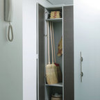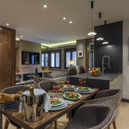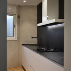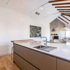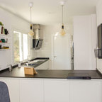 Einzeilige Moderne Küche mit Unterbauwaschbecken, flächenbündigen Schrankfronten, weißen Schränken, Arbeitsplatte aus Holz, Küchenrückwand in Blau, Rückwand aus Spiegelfliesen, Küchengeräten aus Edelstahl, braunem Holzboden, Halbinsel und braunem Boden in Madrid — Houzz