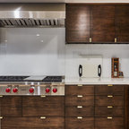 Moderne Küche in L-Form mit Unterbauwaschbecken, offenen Schränken, dunklen Holzschränken, Küchenrückwand in Metallic, Küchengeräten aus Edelstahl und braunem Holzboden in New York — Houzz