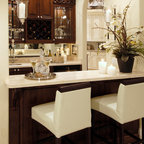 Marble plus brick. Glass pendants don’t overwhelm space or feel heavy