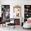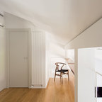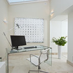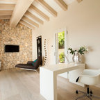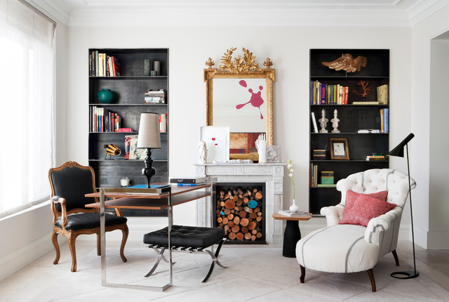 Mittelgroßes Modernes Arbeitszimmer mit Kamin, freistehendem Schreibtisch, Arbeitsplatz, Keramikboden, Kaminsims aus Stein und weißer Wandfarbe in Madrid — Houzz