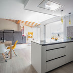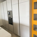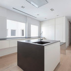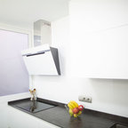 Mittelgroße Moderne Wohnküche in L-Form mit Unterbauwaschbecken, flächenbündigen Schrankfronten, weißen Schränken, Küchenrückwand in Weiß, Küchengeräten aus Edelstahl und Kücheninsel in Palma de Mallorca — Houzz