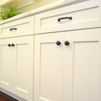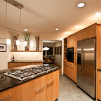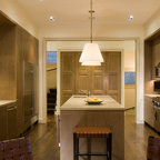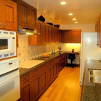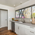 Zweizeilige Moderne Küche mit Unterbauwaschbecken, flächenbündigen Schrankfronten, weißen Schränken und dunklem Holzboden in New York — Houzz