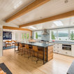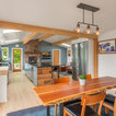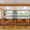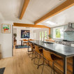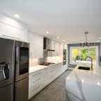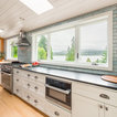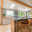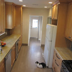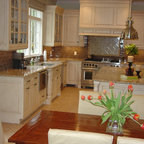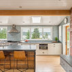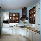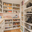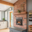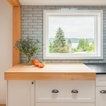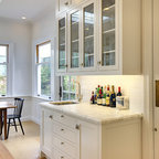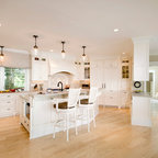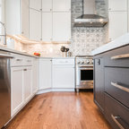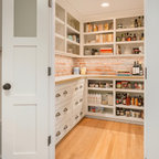 Klassische Küche ohne Insel in U-Form mit Vorratsschrank, offenen Schränken, weißen Schränken, Rückwand aus Backstein, hellem Holzboden und beigem Boden in Seattle — Houzz