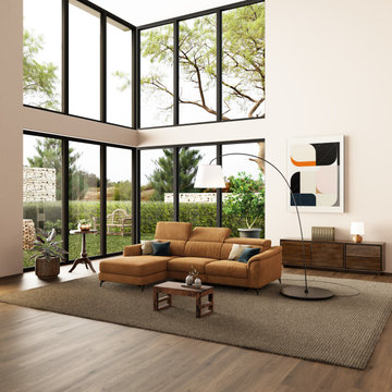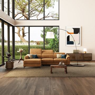 Offenes Modernes Wohnzimmer mit weißer Wandfarbe, braunem Holzboden und braunem Boden in Essen