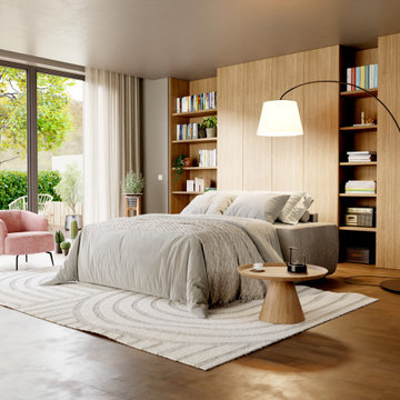 Große, Offene Moderne Bibliothek mit weißer Wandfarbe, braunem Holzboden und braunem Boden in Frankfurt am Main