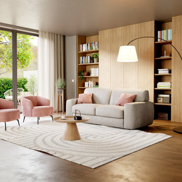 Offenes Modernes Wohnzimmer mit weißer Wandfarbe und grauem Boden in Berlin