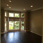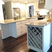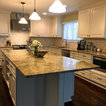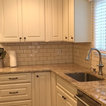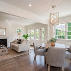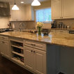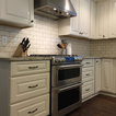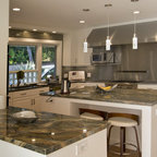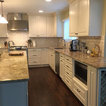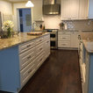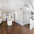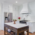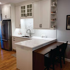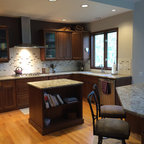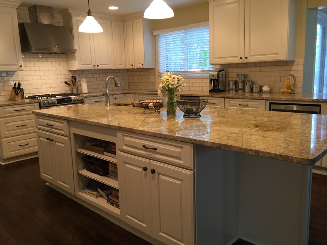 Große Klassische Wohnküche in L-Form mit Unterbauwaschbecken, profilierten Schrankfronten, weißen Schränken, Granit-Arbeitsplatte, Küchenrückwand in Weiß, Rückwand aus Metrofliesen, Küchengeräten aus Edelstahl und dunklem Holzboden in Detroit — Houzz