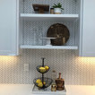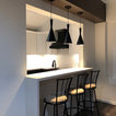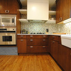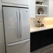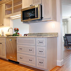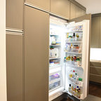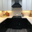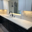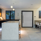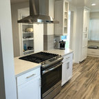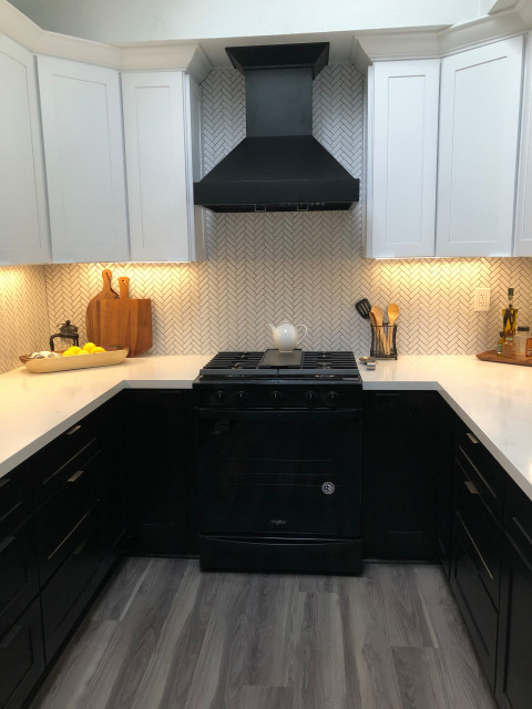 Zweizeilige, Mittelgroße Moderne Küche ohne Insel mit Unterbauwaschbecken, Schrankfronten im Shaker-Stil, schwarzen Schränken, Quarzwerkstein-Arbeitsplatte, Küchenrückwand in Weiß, Rückwand aus Porzellanfliesen, schwarzen Elektrogeräten, Vinylboden, grauem Boden, weißer Arbeitsplatte und gewölbter Decke in Los Angeles — Houzz