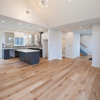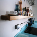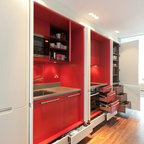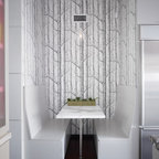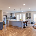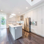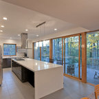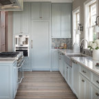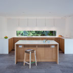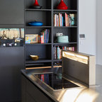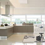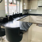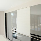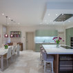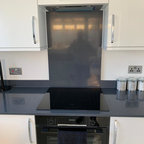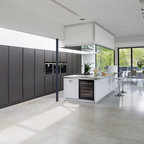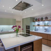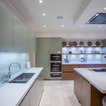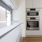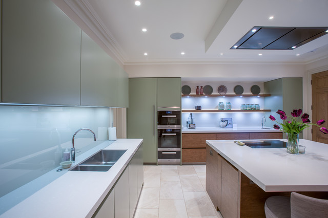 Mittelgroße Moderne Wohnküche in L-Form mit Doppelwaschbecken, flächenbündigen Schrankfronten, grünen Schränken, Mineralwerkstoff-Arbeitsplatte, Küchenrückwand in Weiß, Glasrückwand, schwarzen Elektrogeräten, Keramikboden und Kücheninsel in Hertfordshire — Houzz