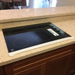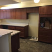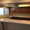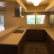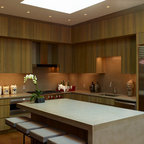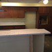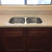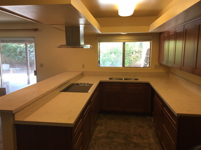 Brown shaker kitchen cabinets with fleece quartz countertops
