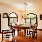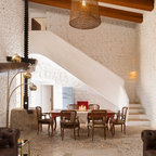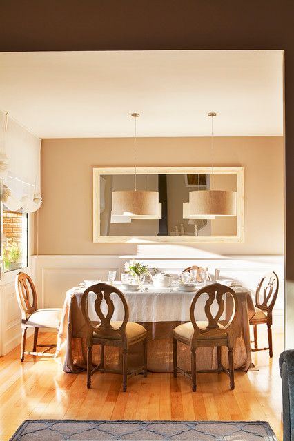 Offenes, Mittelgroßes Landhaus Esszimmer mit beiger Wandfarbe, braunem Holzboden und beigem Boden in Madrid — Houzz