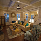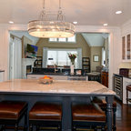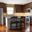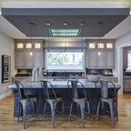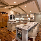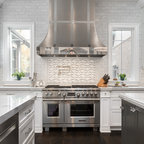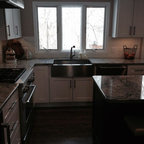 Große Klassische Wohnküche in L-Form mit Unterbauwaschbecken, Schrankfronten im Shaker-Stil, dunklen Holzschränken, Granit-Arbeitsplatte, Küchenrückwand in Braun, Rückwand aus Metrofliesen, Küchengeräten aus Edelstahl, dunklem Holzboden und braunem Boden in Charlotte — Houzz
