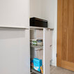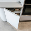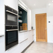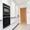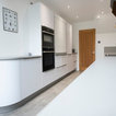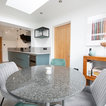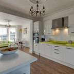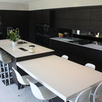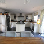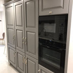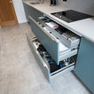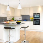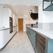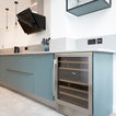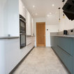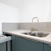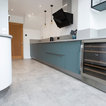 Zweizeilige, Mittelgroße Moderne Wohnküche ohne Insel mit Unterbauwaschbecken, flächenbündigen Schrankfronten, blauen Schränken, Quarzit-Arbeitsplatte, Küchenrückwand in Grau, Küchengeräten aus Edelstahl, grauem Boden und grauer Arbeitsplatte in Kent — Houzz