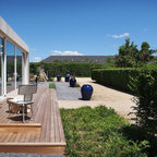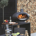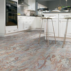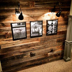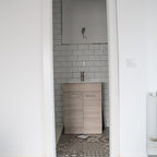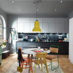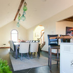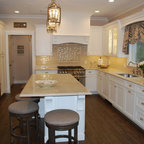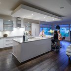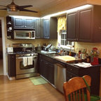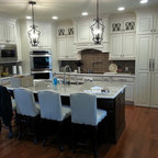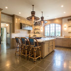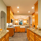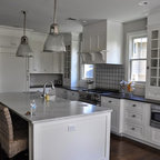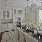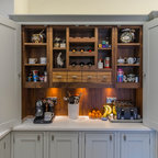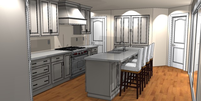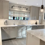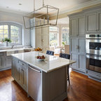 Geschlossene, Einzeilige, Mittelgroße Klassische Küche mit Landhausspüle, profilierten Schrankfronten, grauen Schränken, Quarzwerkstein-Arbeitsplatte, Elektrogeräten mit Frontblende und braunem Holzboden in Sonstige — Houzz