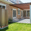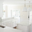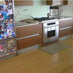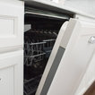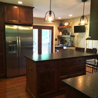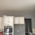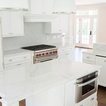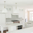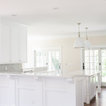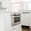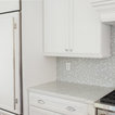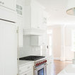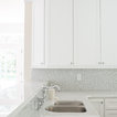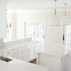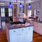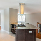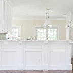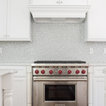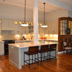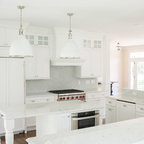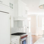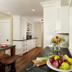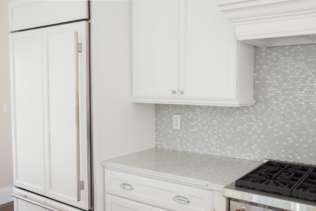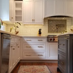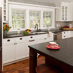 Mittelgroße Klassische Küche mit Schrankfronten mit vertiefter Füllung, weißen Schränken, bunter Rückwand, Rückwand aus Glasfliesen, Küchengeräten aus Edelstahl, braunem Holzboden und Doppelwaschbecken in Boston — Houzz