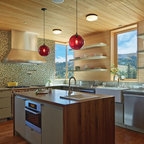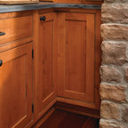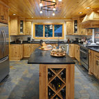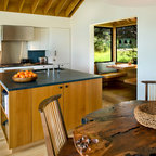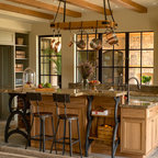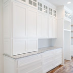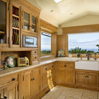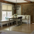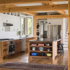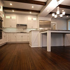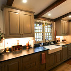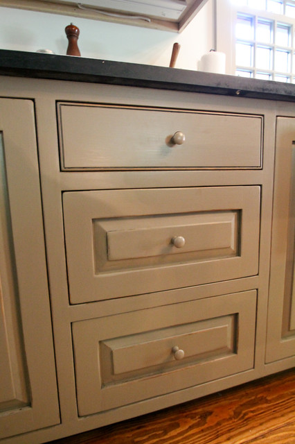Offene, Mittelgroße Landhausstil Küche in L-Form mit Landhausspüle, profilierten Schrankfronten, grauen Schränken, Mineralwerkstoff-Arbeitsplatte, Rückwand-Fenster, Küchengeräten aus Edelstahl, braunem Holzboden, Kücheninsel, braunem Boden und schwarzer Arbeitsplatte in Bridgeport — Houzz
