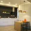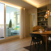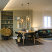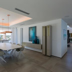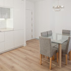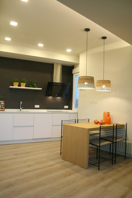 Mittelgroße Moderne Wohnküche ohne Kamin mit beiger Wandfarbe und braunem Holzboden in Madrid — Houzz