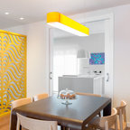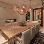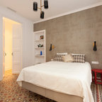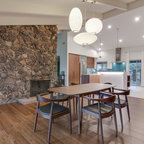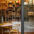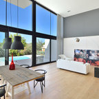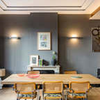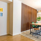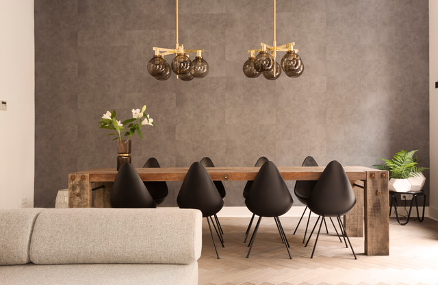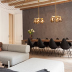 Offenes, Mittelgroßes Modernes Esszimmer ohne Kamin mit brauner Wandfarbe und hellem Holzboden in Barcelona — Houzz