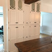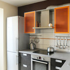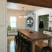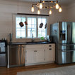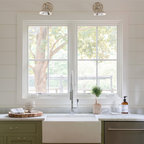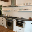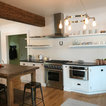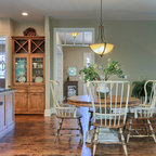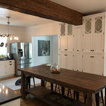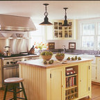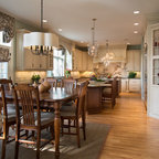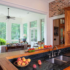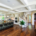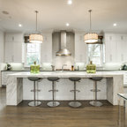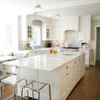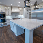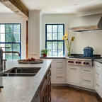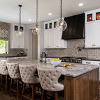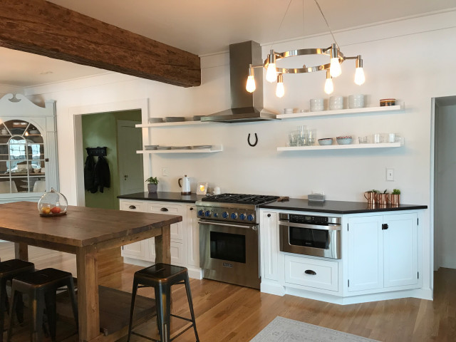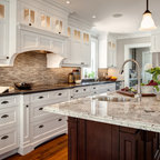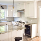 Mittelgroße Landhaus Wohnküche in U-Form mit Unterbauwaschbecken, Schrankfronten mit vertiefter Füllung, weißen Schränken, Quarzwerkstein-Arbeitsplatte, Küchenrückwand in Weiß, Rückwand aus Metrofliesen, Küchengeräten aus Edelstahl, braunem Holzboden, Kücheninsel, braunem Boden und schwarzer Arbeitsplatte in Sonstige — Houzz