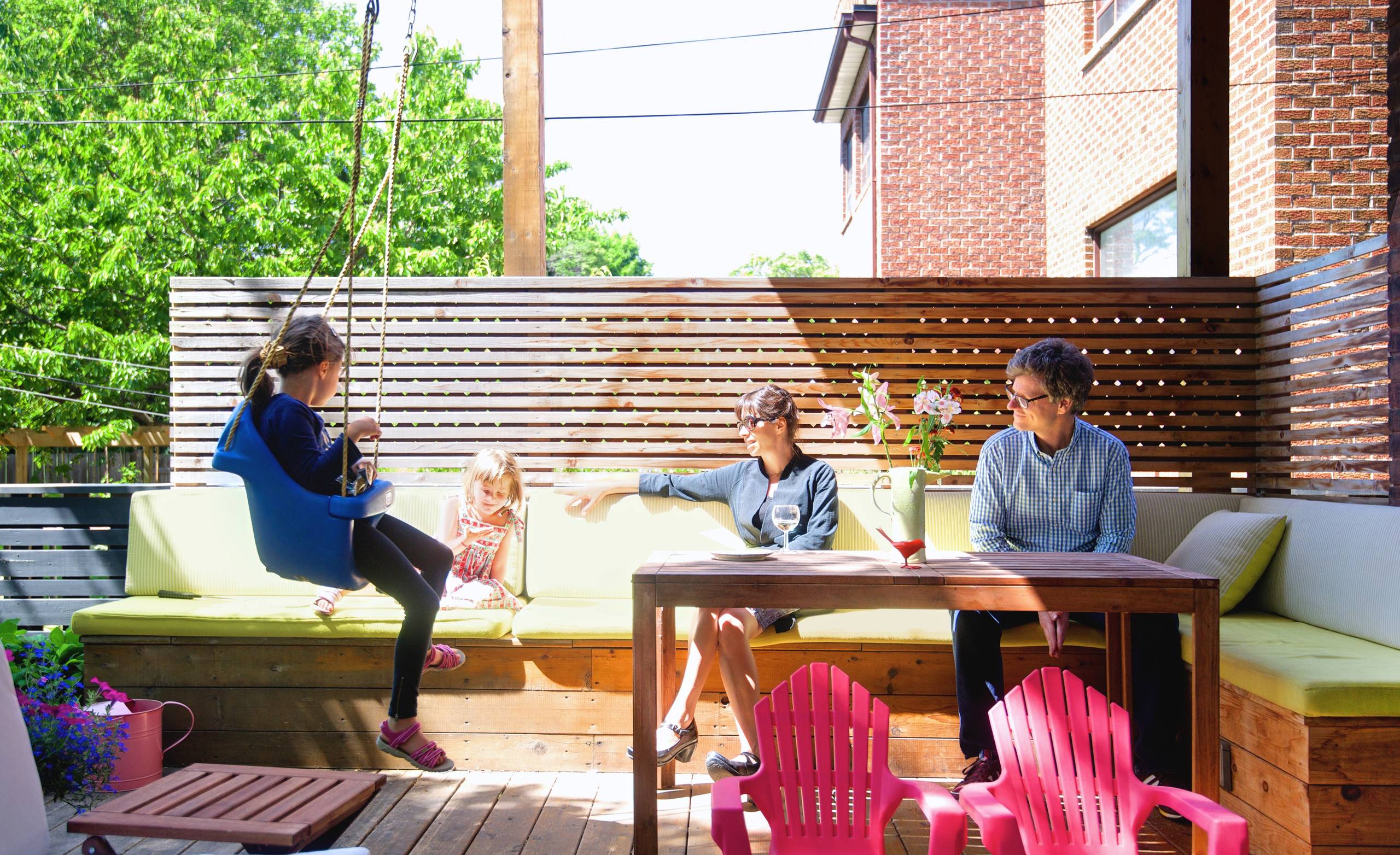 Sitzschutz und Rückenlehne in Einem – hier übernimmt die Holzwand über Eck gleich zwei wichtige Funktionen. Das ebenfalls über Eck gebaute simple Holzpodest davor fungiert als Sitzfläche und bietet mit vielen Kissen und Polstern genug Platz für die ganze Familie, zum Toben, Kuscheln und Ausruhen. Richtig familienfreundlich wird es vor allem durch die gemütliche Sitzschaukel.