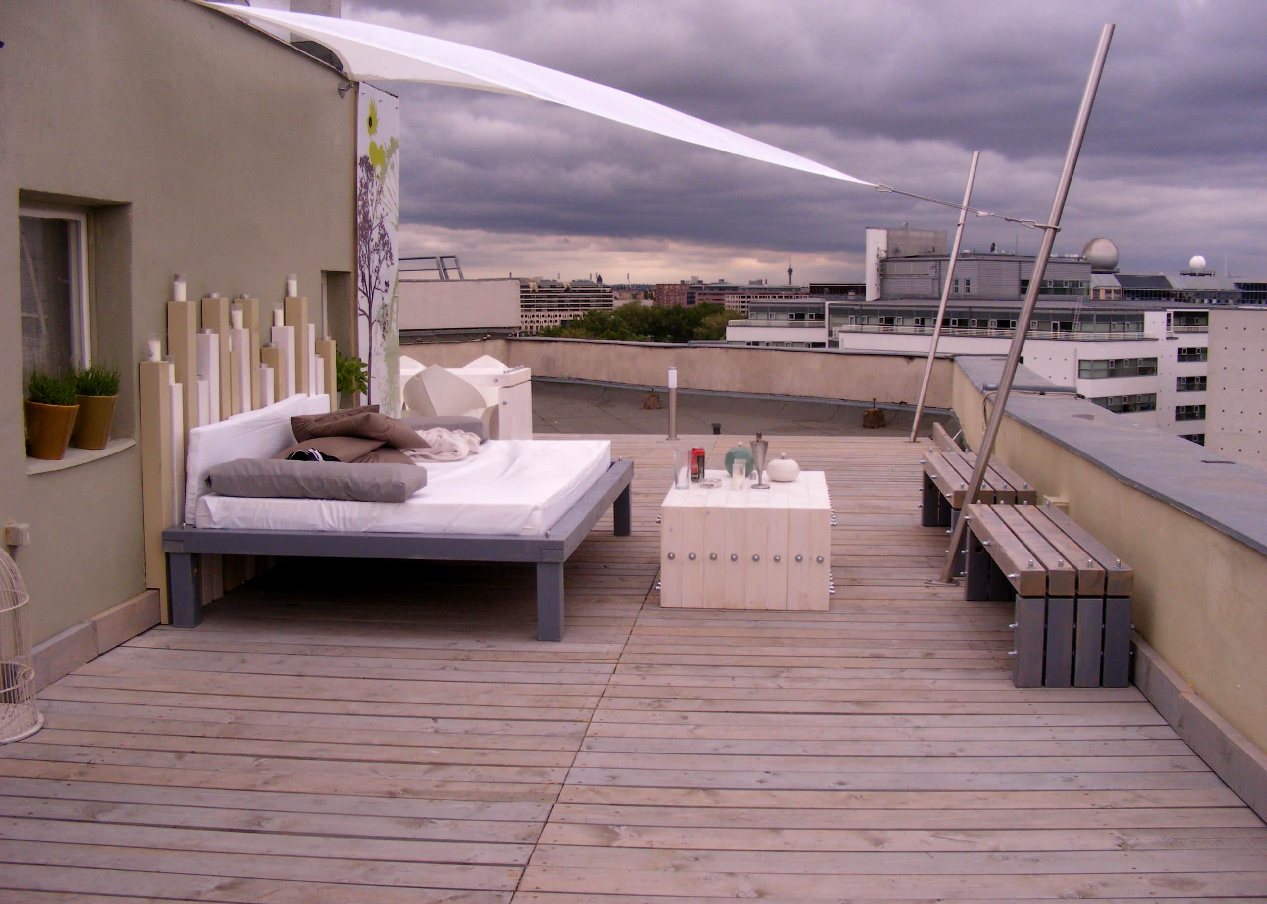 Oder zieht es Sie eher nach Asien? Vom letzten oder nächsten Urlaub in Thailand träumt es sich am besten in diesem großzügigen Himmelbett. Die einfache Lattenkonstruktion steht auf je zwei schwarz lackierten Backsteinen, die gleichzeitig den Betthimmel halten. Drei traditionelle Dreieckskissen mit Kapokfüllung polstern hier statt einer herkömmlichen Matratze die Liegefläche aus. Tagsüber dient der Betthimmel als willkommener Schattenspender. Nachteulen und passionierte Sterndeuter ziehen für freie Sicht aufs Firmament den Himmel wie einen Vorhang nach vorn oder hinten.