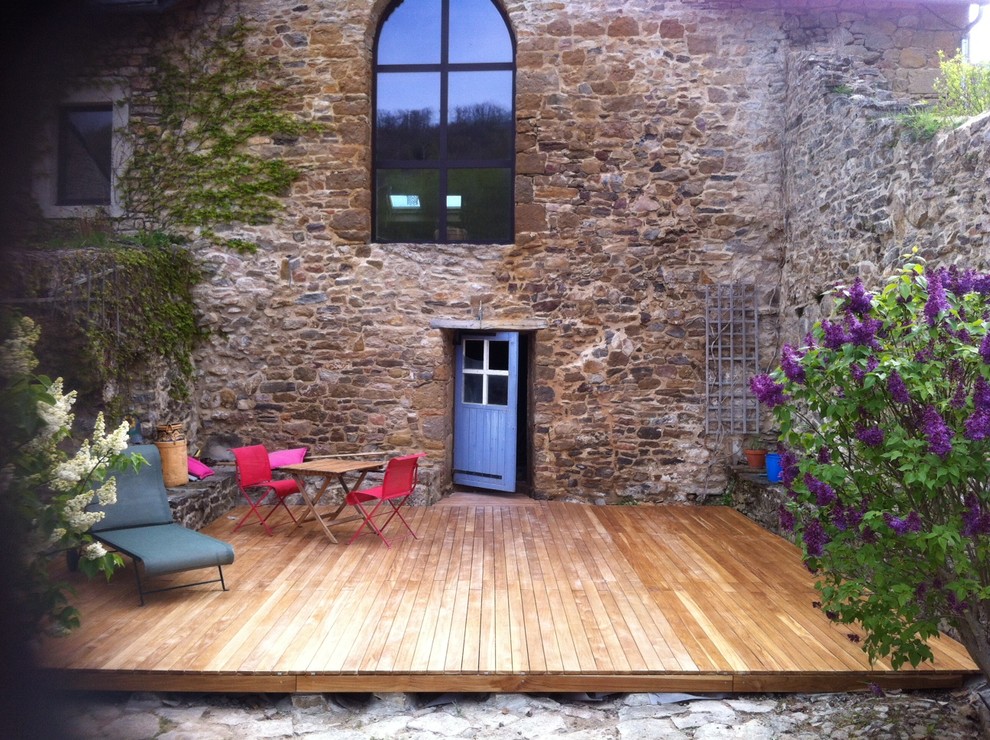 Hier war das alte Gemäuer des Hauses Formgeber für eine schlichte Holzterrasse – geschützt vor Wind und Blicken. Der vorhandene Mauervorsprung ganz links im Bild bietet mit ein paar Kissen auch einen herrlichen Liegeplatz.