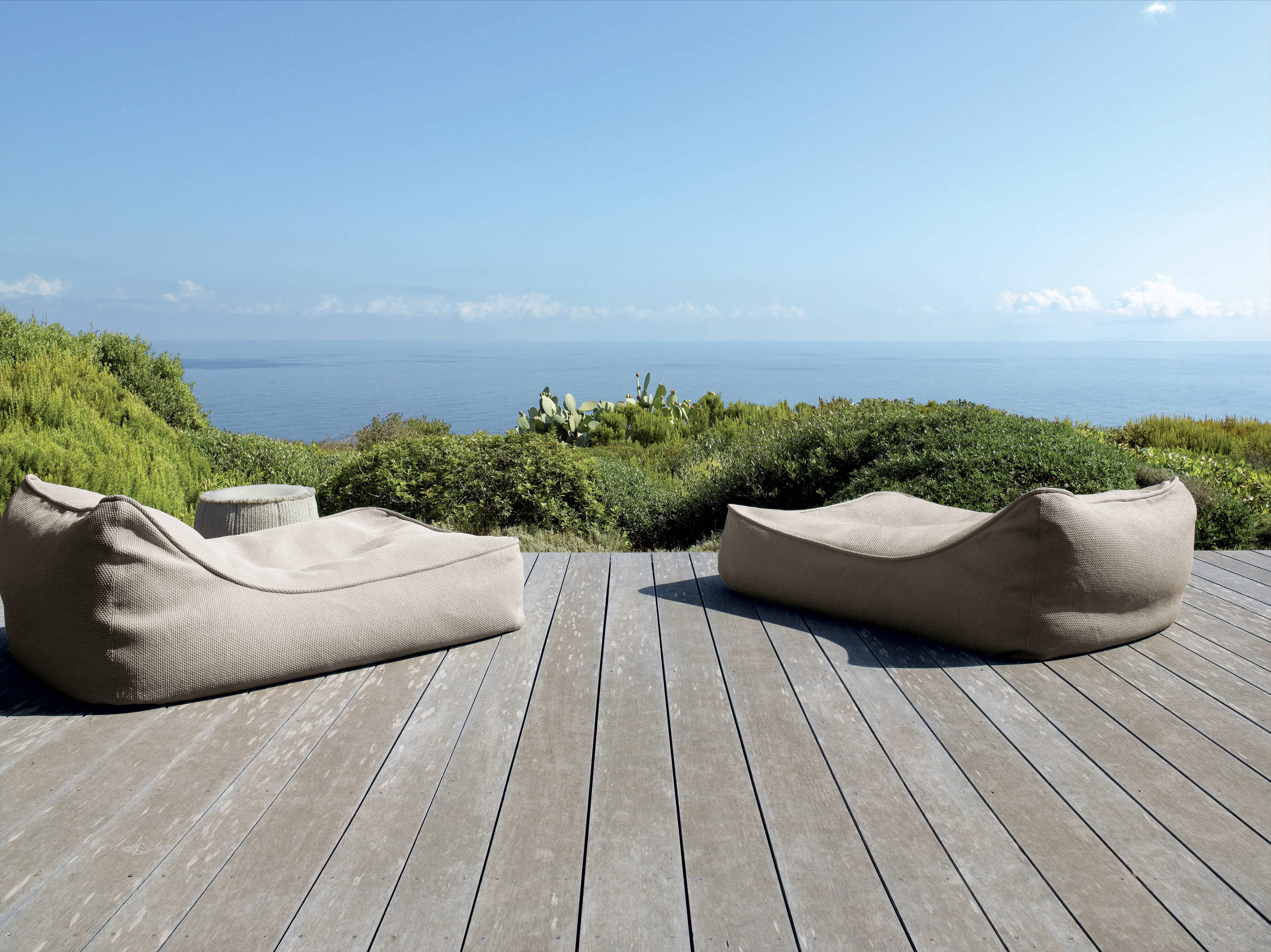 Zugegeben, diese Terrasse ist ziemlich überschaubar eingerichtet – um nicht zu sagen, minimalistisch. Aber wer braucht bei diesem Ausblick eigentlich noch mehr als einen bequemen Liegesessel, auf den man sich mit staunendem Blick rücklings fallen lassen kann? Deshalb sind diese zwei ausladenden Bean Bags („Float“ von Paola Lenti) wohl die perfekte Wahl.