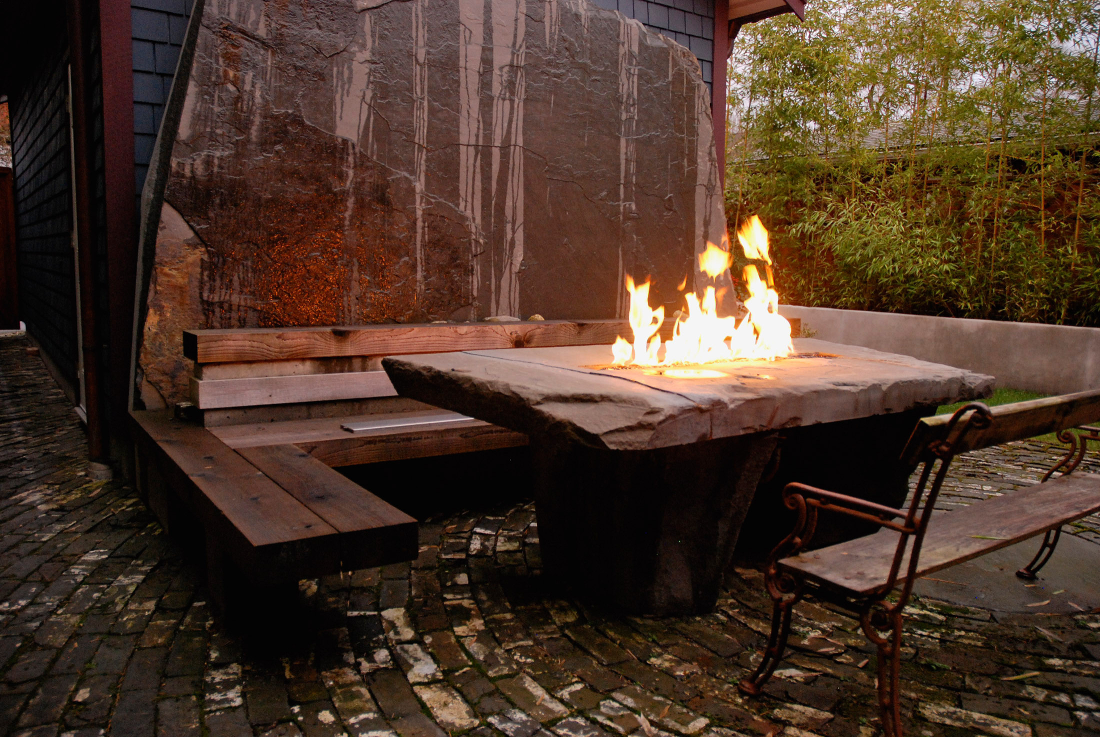 Eine Sitzlandschaft mit uriger Lagerfeuerromantik – fast schon eine magische Atmosphäre schafft diese rustikale Sitzecke aus massiven Holzbohlen um die Feuerstelle mit Steintisch. Während das Feuer Lichtspiele auf die massive Steinwand im Hintergrund wirft, hört man förmlich das Knacken der brennenden Holzscheite. Da schauen wir voller Vorfreude auf die Zeit, in der die Tage wieder kürzer werden und man allen Grund hat, sich seine kalt gewordenen Finger am offenen Feuer zu wärmen.